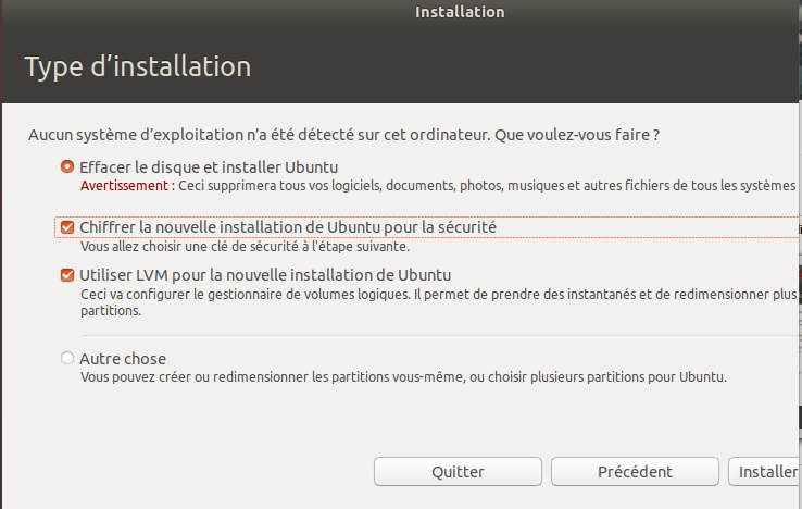 – Choisir le Type d’installation et bien penser à cocher "Chiffrer la nouvelle installation de Ubunutu pour la sécurité" :