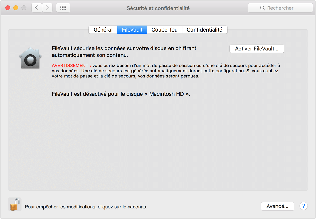 * Pour vérifier que le disque est chiffré avec Filevault, aller dans Préférences Système, puis Sécurité et Confidentialité et cliquer sur l’onglet FileVault. Il doit y avoir marqué *FileVault est activé pour le disque "Macintosh HD"*