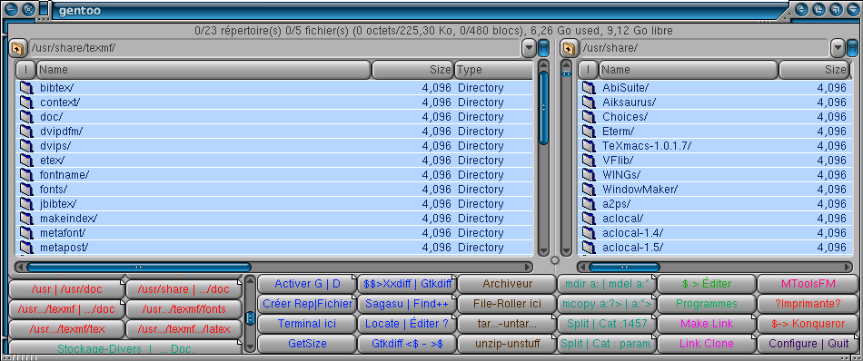 de fichiers Gentoo Il ya beaucoup de gestionnaires de fichiers qui tournent sous Linux (nautilus pour Gnome, konqueror pour KDE, xfwm4 ou Thunar pour xfce4,...). Aucun ne m'a semblé vraiment satisfaisant. Finalement, après de nombreux essais, je pense que le plus pratique est Gentoo. On peut faire pratiquement tout ce que l'on veut, en ce qui concerne la gestion des fichiers, avec Gentoo, et ce, très facilement. C'est loin, très loin, d'être le cas pour tous les autres... Le seul petit défaut (il est essentiellement sans bug) est qu'il utilise les librairies Gtk-1.2 qui sont déjà bien anciennes et pour lesquelles les distributions récentes ne fournissent pas de thème, ce qui fait que son aspect par défaut est assez inesthétique. Naturellement on peut y remédier en installant un thème qui gère à la fois Gtk-1.2 et Gtk-2.0. Pour ceux qui n'aiment pas l'utilisation de librairies graphiques il existe Worker qui est très similaire bien que un peu plus compliqué d'utilisation. |